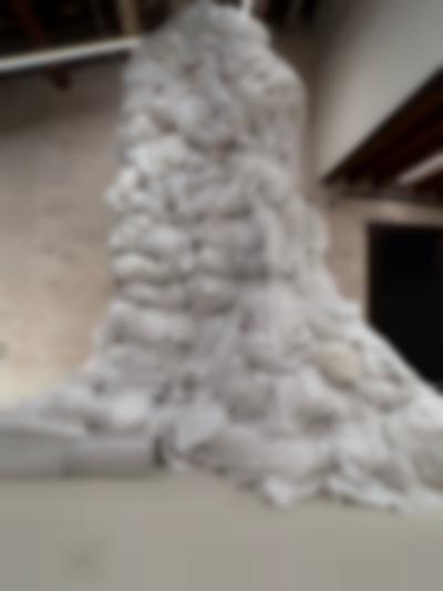 Cette tour est fabriquée à partir de linge usagé provenant d’hôtels de luxe et témoignant des dégradations provoquées par le tourisme de masse.